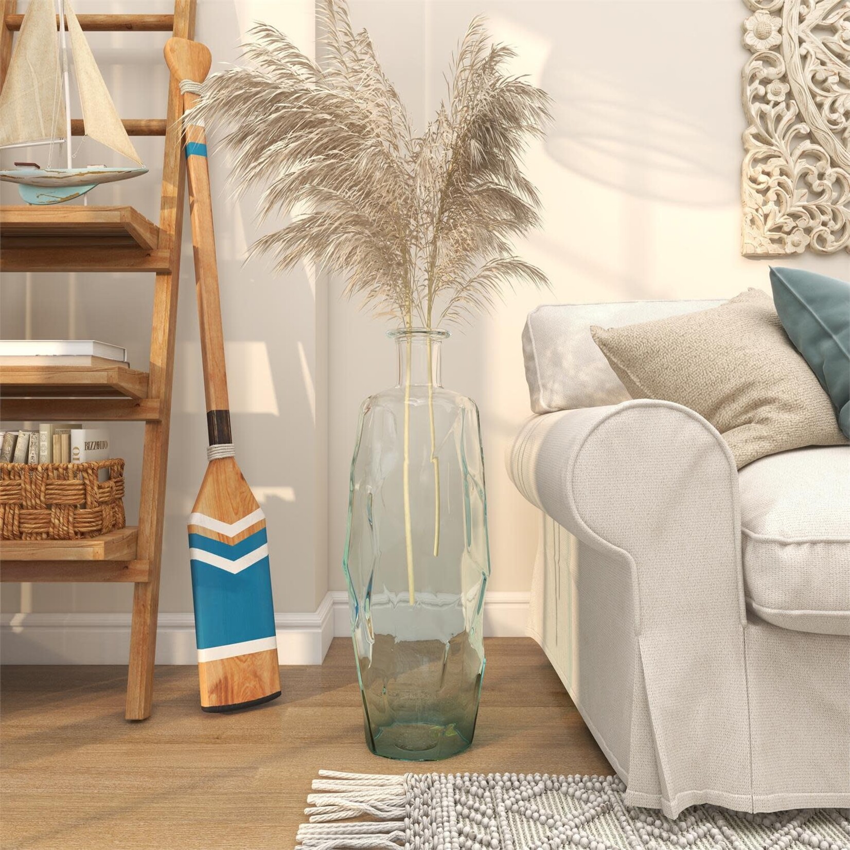 The clear recycled glass vase measures 11L x 11W x 29H inches, and weighs 22 lbs